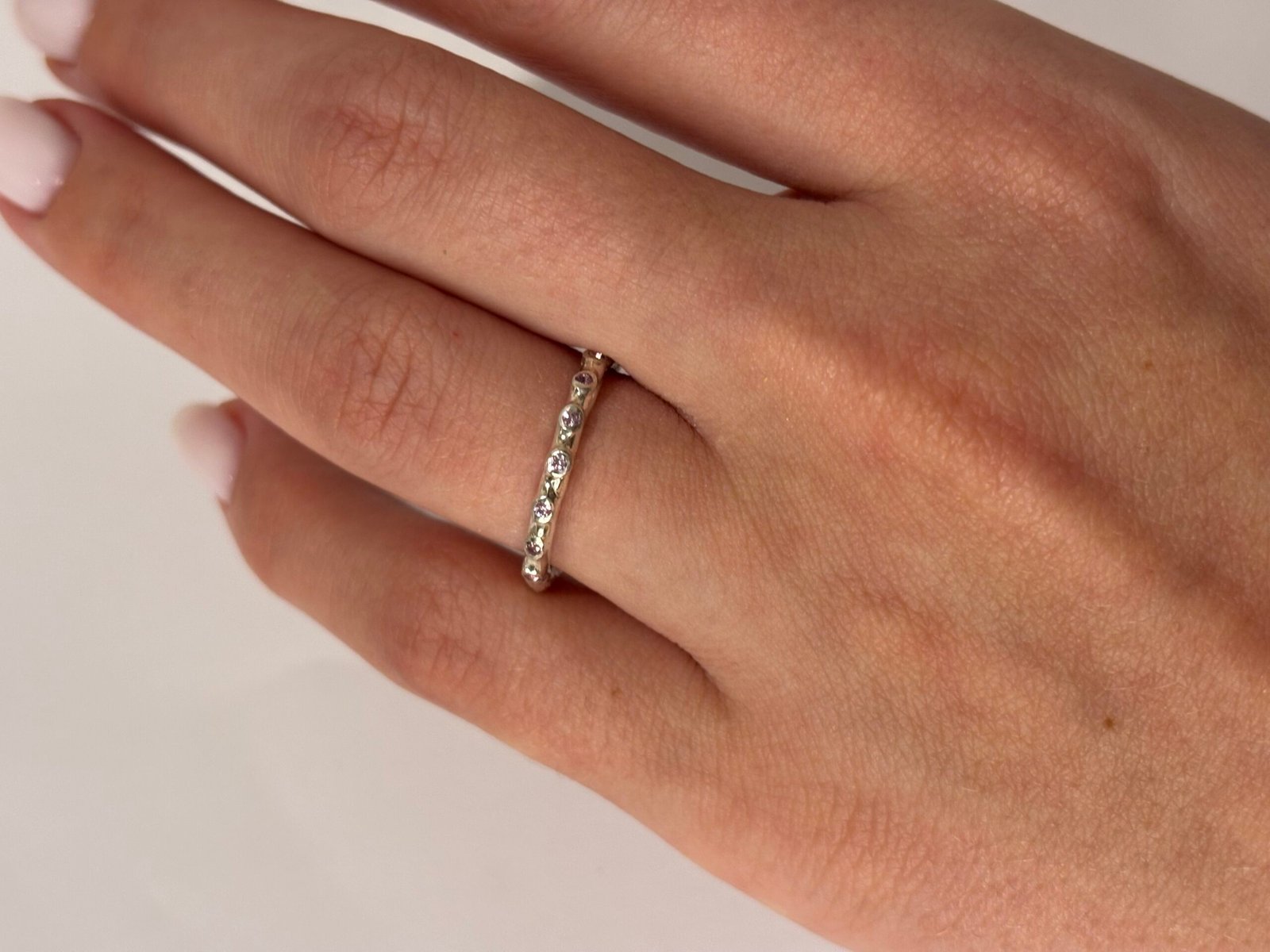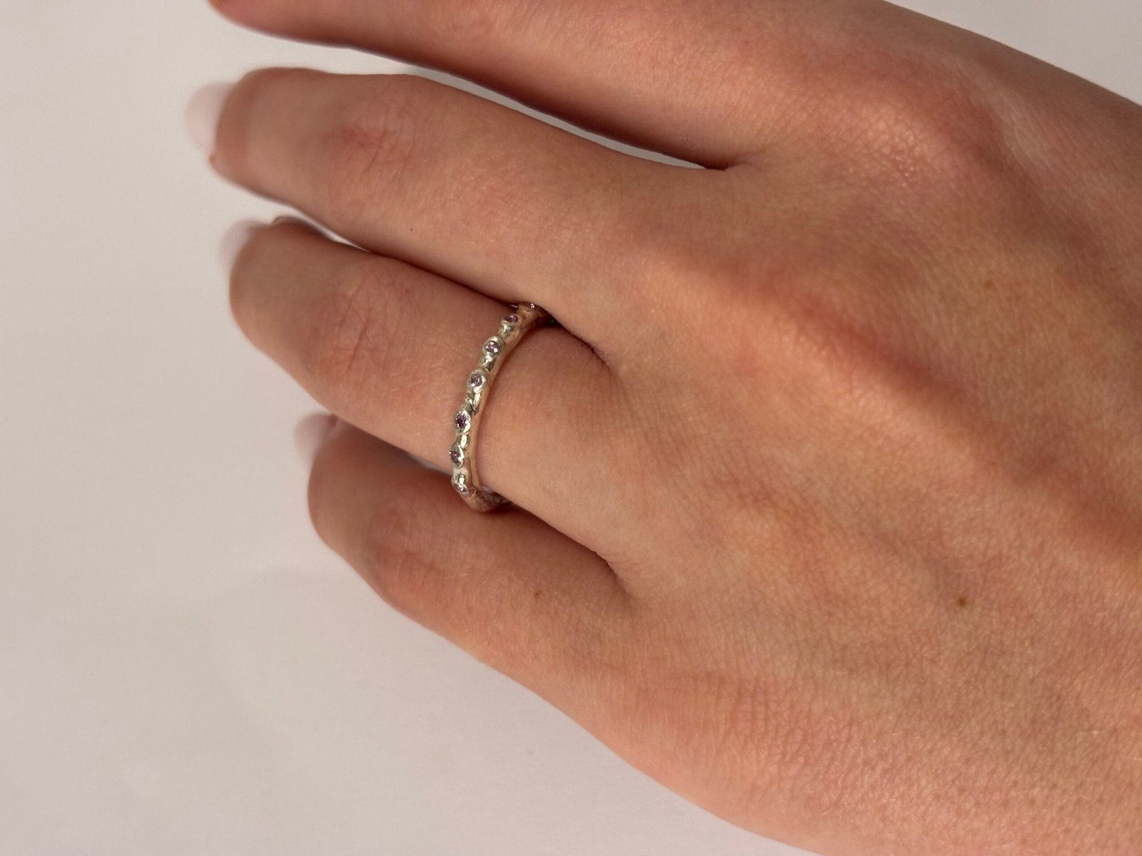 Ypatingai subtilus žiedas. Puoštas septyniais švelnios melsvai/violetinės spalvos safyrais. Safyrai visais laikais buvo ypatingai vertinami brangakmeniai, kurie ir šiomis dienomis labai populiarūs.